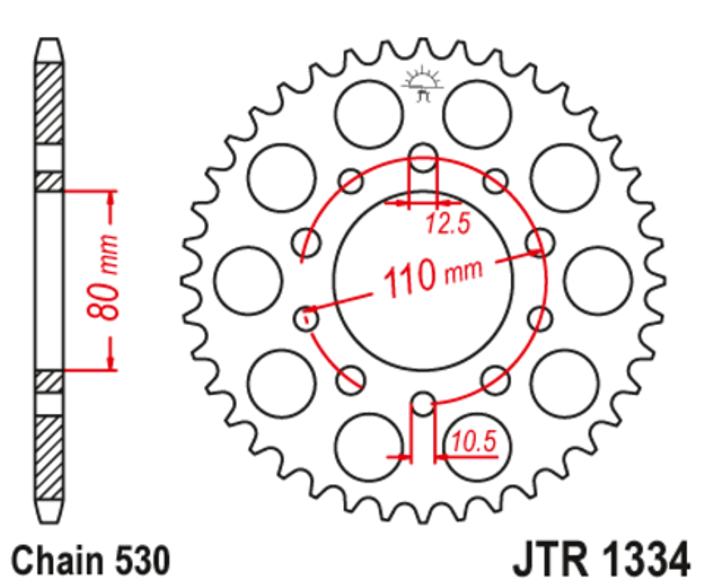 JTR1334 – ведомая задняя звезда мотоцикла для цепи с 530 шагом. Имеет размерный ряд от 34 до 47 зубьев.