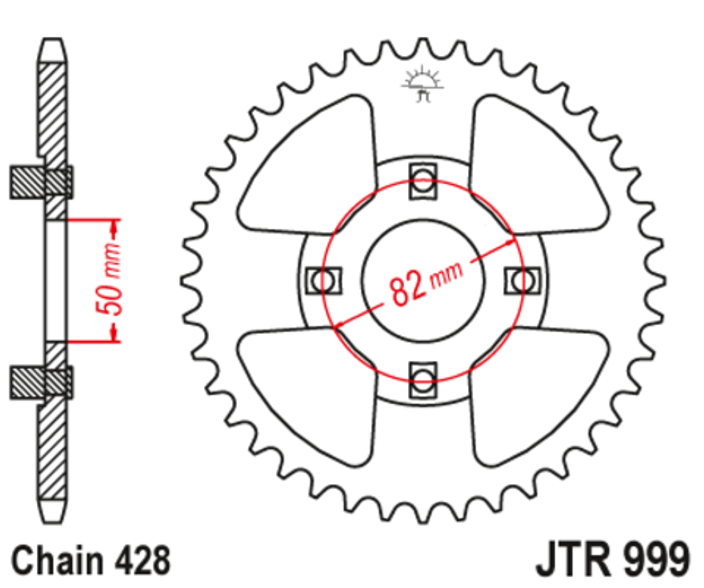 JTR999 – ведомая задняя звезда мотоцикла для цепи с 428 шагом. Имеет размерный ряд от 42 до 50 зубьев.
